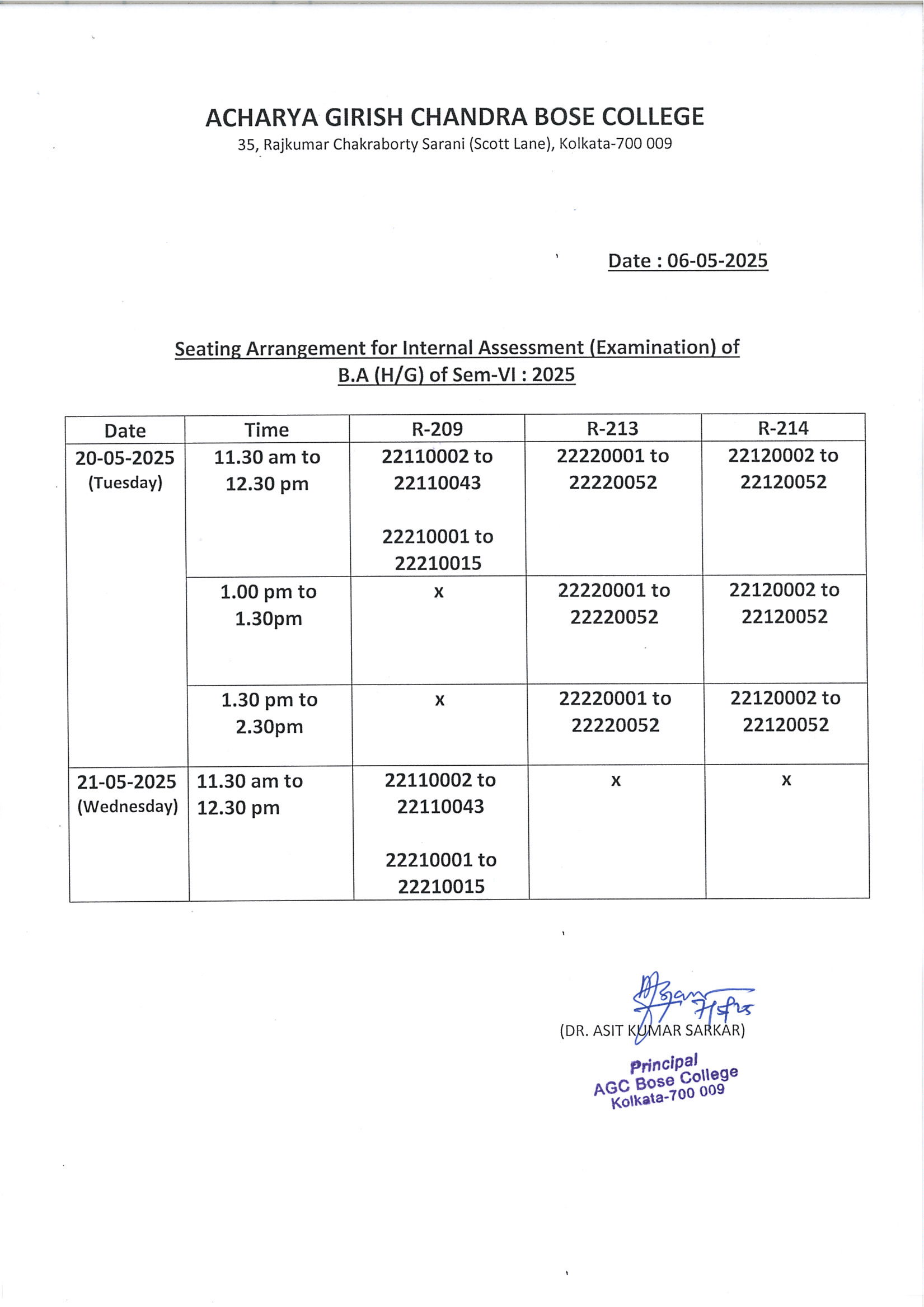Seating Arrangment for Internal Assessment (Examination) of B.A (H/G) of Sem-VI: 2025