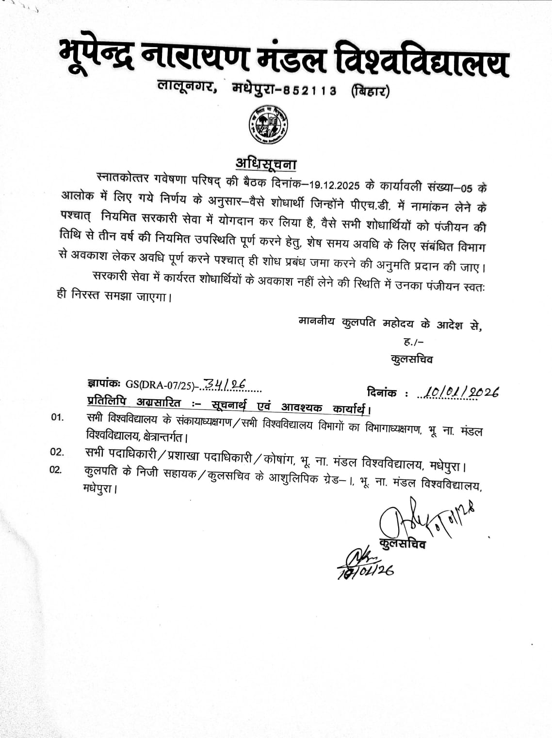 All research scholars who, after enrolling in the Ph.D. program, have joined regular government service shall be permitted to submit their thesis only after completing the remaining period of mandatory regular attendance of three years from the date of registration by taking leave from the concerned department for the required duration.